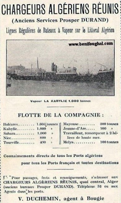 Nous apprenons que sous peu de jours sera inauguré le nouveau service de bateaux à vapeur que les Transports maritimes Algériens (Prosper Durand), viennent de créer entre Alger, Dellys, Bougie, Djidjelli, Philippeville, Bône et vice versa :