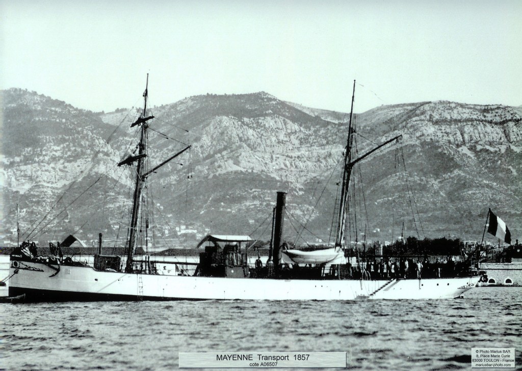 Mayenne, ex Ettrick : Cargo construit en 1875 à Southshields pour l’armement anglais L FAULKNER ; acheté par F. LANGSTAFF (de Nantes), puis, en 1882 par la Marine nationale sous le nom de « Mayenne« et l’utilise comme transport, notamment pour le ravitaillement en essence de Port-de-Bouc à Toulon. Acquis en 1893 par Prosper DURAND qui lui garde son nom. Vendu en 1912 aux Chargeurs algériens réunis, incorporé à la liquidation de ceux-ci en 1919 à la compagnie mère, les Affréteurs réunis; désarmé à la faillite de ces derniers en 1923 et vendu à la démolition en Italie en 1926.